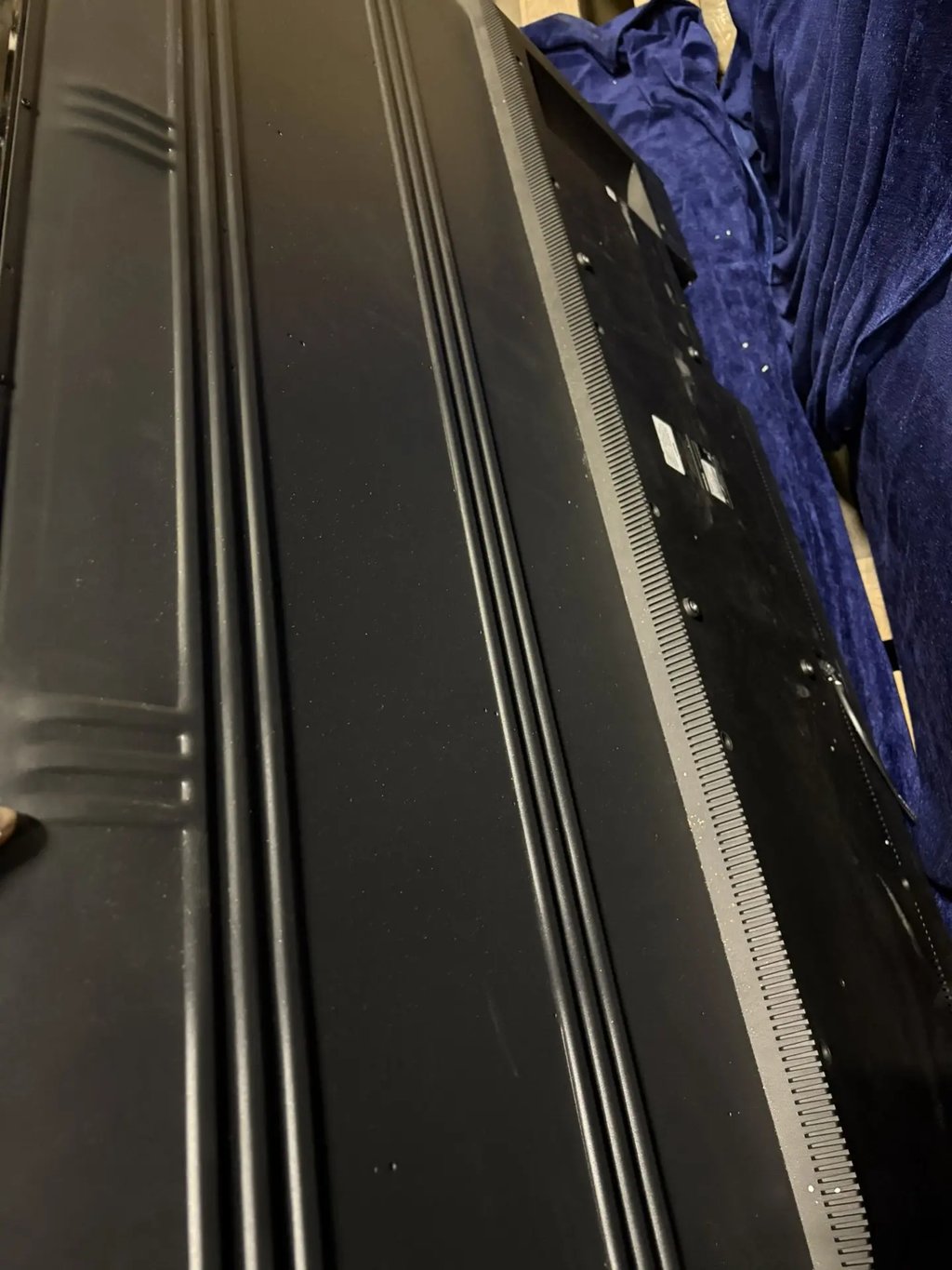 Упаковка вскрывалась. Оборудование использовалось. Потертости и царапины на корпусе. В комплекте пульт и ножки. Нет винтов для крепления ножек.