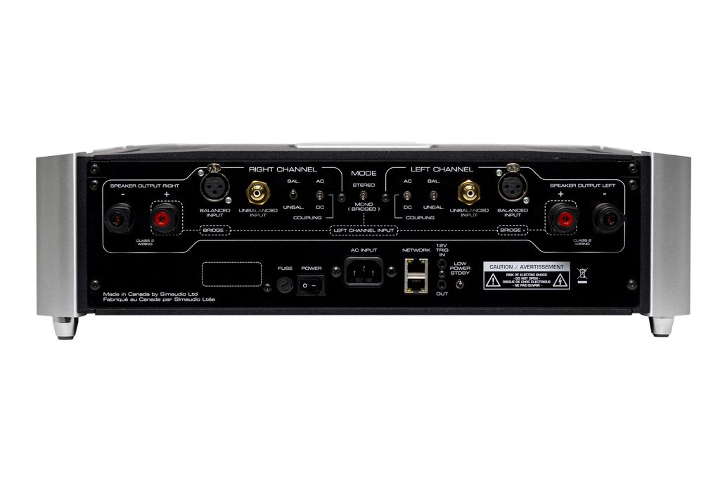 Усилитель Moon by Simaudio 761 предлагает 200 Вт на канал при нагрузке 8 Ом в стерео режиме и до 600 Вт на 8 Ом в режиме моноблока. Также предусмотрен переключатель для мостового подключения.