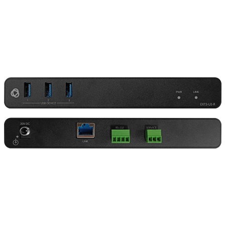 EXT3-U3-R — приемник USB 3.2 Gen1 по кабелю витой пары с поддержкой двустороннего питания PoC. Прибор получает основанный на формате HDBaseT сигнал CATx по кабелю медной витой пары от совместимого передатчика (например EXT3-U3-T) и преобразует его в исходные сигналы USB 3.2 Gen1, а также сигналы управления RS-232. Устройство работает по принципу Plug&Play и не требует какой-либо предварительной настройки. Прибор поддерживает широкий спектр периферийных устройств USB, а также все режимы передачи USB, включая прерывание, массовый и изохронный, и особенно подходит для USB-устройств с высокой скоростью передачи видеопотока, таких как камеры и устройства захвата.