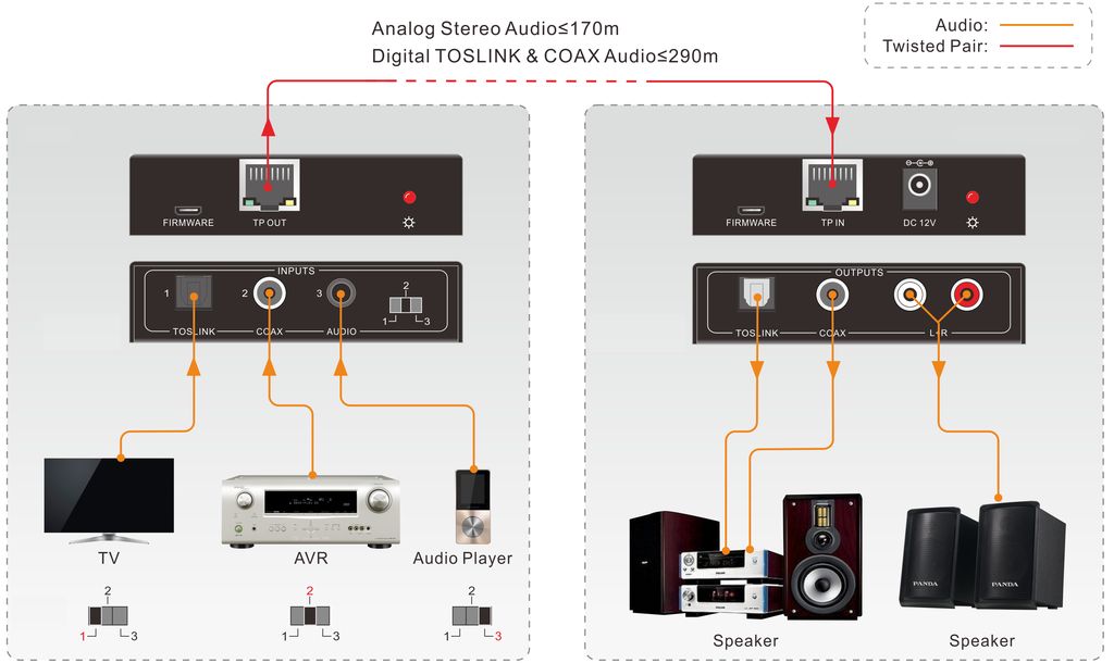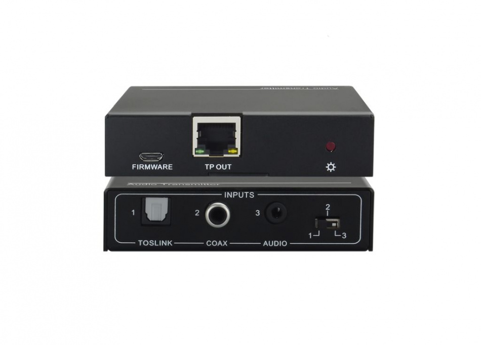 Удлинитель аудио сигнала позволяет передавать сигнал с одного из 3 (трех) источников по кабелю на витой паре на расстояние до 170 метров для аналогового аудио и до 290 метров для цифрового аудио.