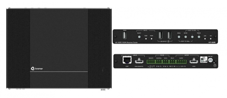 KIT-500 — комплект, состоящий из передающего и приёмного устройств. Передающее устройство KIT-500Т производит независимую (матричную) коммутацию сигнала с двух входов USB-C и двух комбинированных входов HDMI/USB на выходы HDMI и HDBaseT. Приёмное устройство KIT-500R осуществляет автоматический выбор между входом HDMI и входом HDBaseT и преобразует сигнал HDBaseT, принимаемый от передатчика KIT-500Т по кабелю типа «витая пара», в сигналы HDMI и USB с осуществлением повышающего или понижающего масштабирования видеосигнала c целью приведения разрешения к собственному разрешению подключенного к приёмнику дисплея HDMI. Данное решение позволяет подключить удалённые периферийные устройства (например USB-камеры) к локальному хосту. Комплект KIT-500 обеспечивает передачу сигнала по кабелю витой пары на расстояние до 40 м для разрешения 4K@60 Гц (4:2:0), и на расстояние до 70 м для разрешения Full HD 1080р@60 Гц.