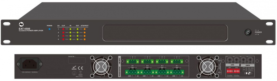 Номинальная выходная мощность Exell EAT4500 составляет 4×500 Вт, поэтому его можно использовать в качестве четырёхзонной системы фонового озвучивания с несколькими источниками при минимальных затратах. Универсальные выходы громкоговорителя с высоким сопротивлением 100 В и низким сопротивлением от 4 Ом позволяют использовать его как в трансляционных инсталляциях, так и при установке стереозвука.