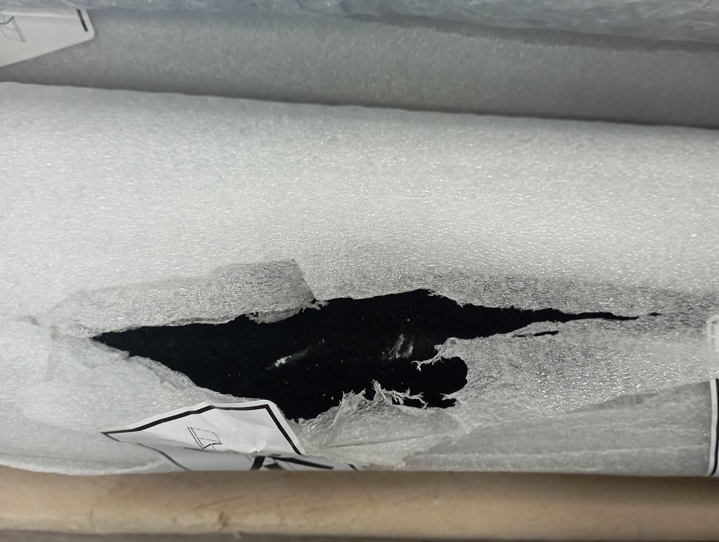 Упаковка вскрывалась не полностью, повреждена. Оборудование не использовалось. В одном месте велюр поврежден до металла.